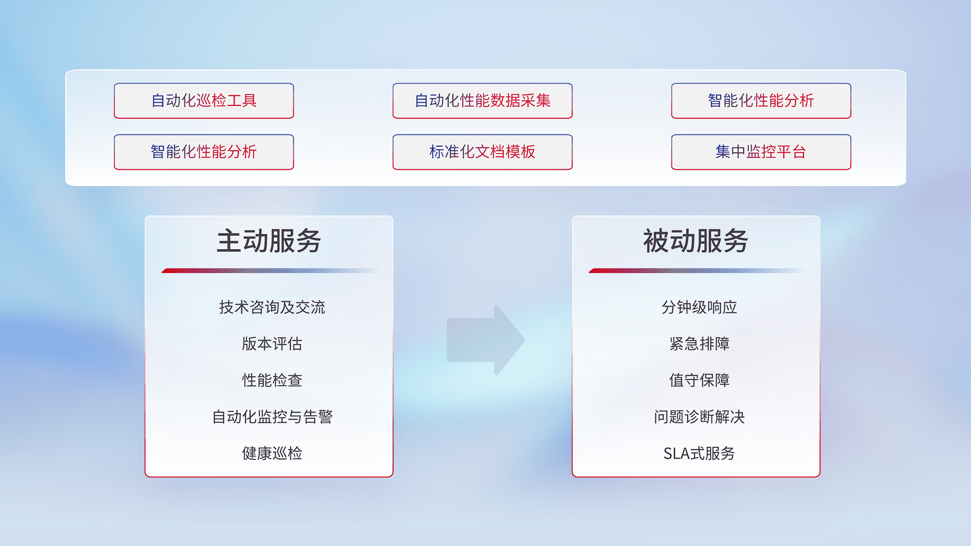 智能化工具和标准化文档,,,保障服务质量,,,,提供主动服务(包含技术咨询、、、版本评估、、性能检查、、、、自动化监控与告警、、健康巡检)和被动服务包含(分钟级响应、、、紧急排障、、、值守保障、、问题诊断解决、、、、SLA服务)。。。。