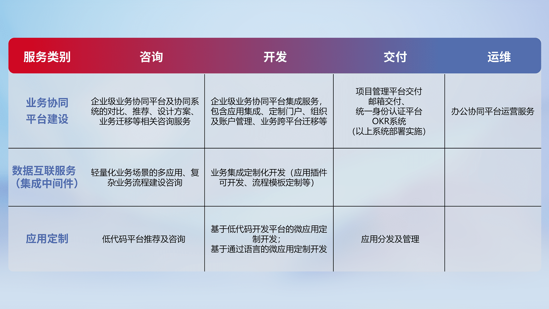 针对钉钉、、、企微、、、IDaas等平台级产品提供产品的规划、、方案、、、交付、、定制化开发等服务,,,实现如统一协同办公、、、、智能客户服务、、混合会议管理、、智能数据查询、、等业务场景,,实现数字化转型。。